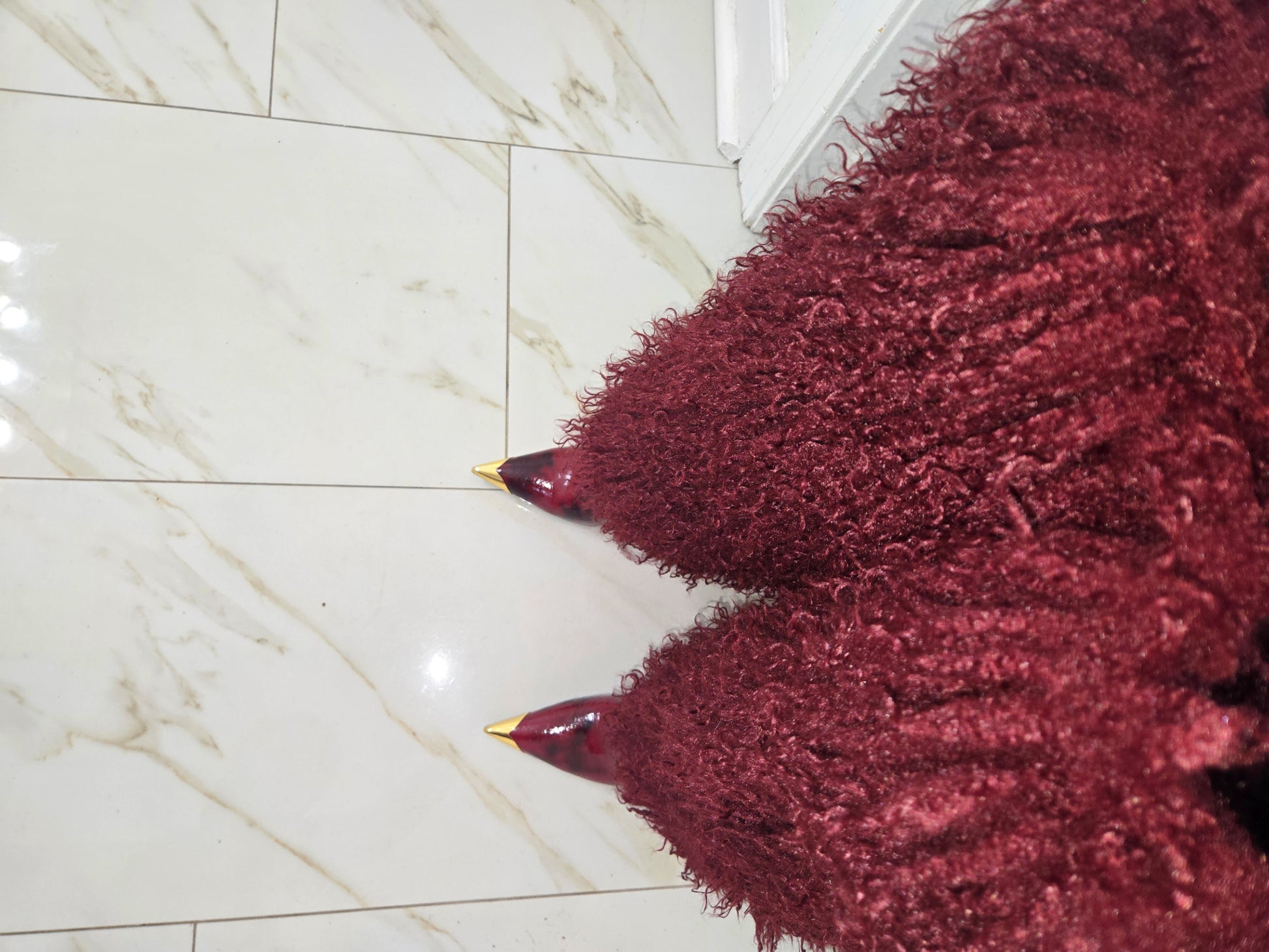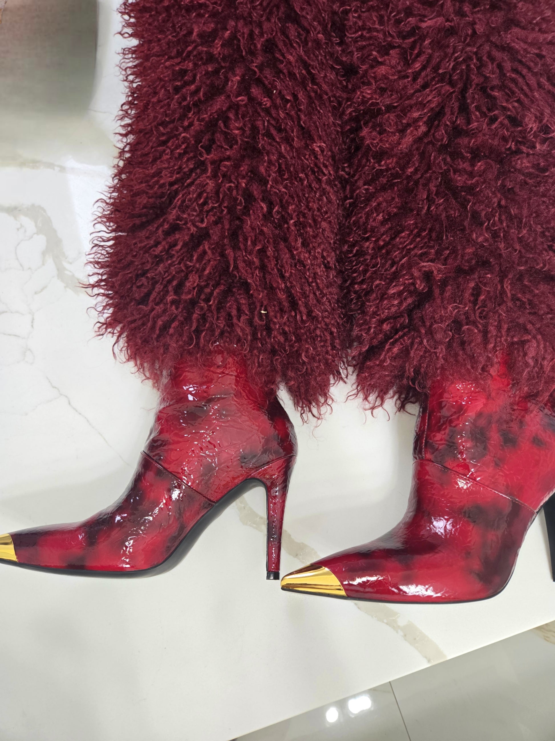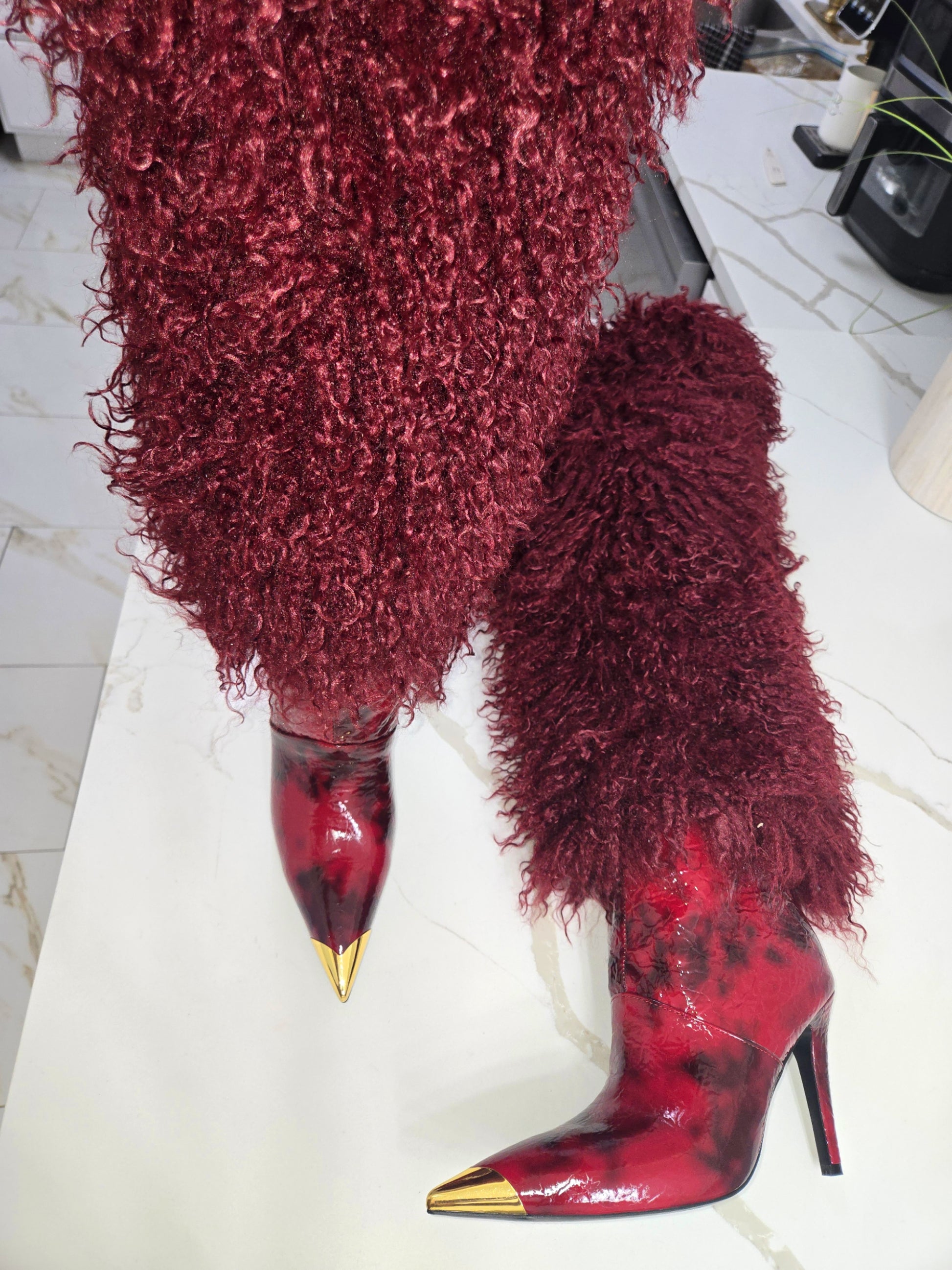 The Empress 69™ is crafted for women who don’t ask — they arrive. A razor-sharp gold-plated toe meets high-gloss patent leather, finished with plush, indulgent thigh-high fur that moves when you move.